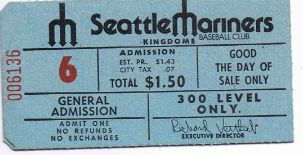 Ticket stub from the inaugural season - only $1.50 for a seat!The funny thing is, I grew up in an area without baseball. Naturally, since the first game I had seen was the New York Mets, they were my favorite team. By the time we moved to Seattle, the American League awarded the city a franchise. I followed the expansion draft and every move the club made. Once the inaugural season began, I listened to most games on the radio and caught a few on TV or in person.