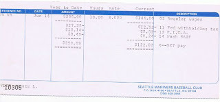 Last week, I reported that I was paid $6 per game. I was wrong. As I dug through a box of memorabilia, I found some old pay stubs from the Mariners. I was actually paid $8 per game. That's 25% more than I remembered!
