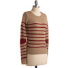 2) Those "patches" are fully-fashioned, meaning that stitches were ADDED across the sleeve in a technique called "short row shaping". See how the sleeve bends when it hangs? Almost like an arm? That's because stitches were added in there.