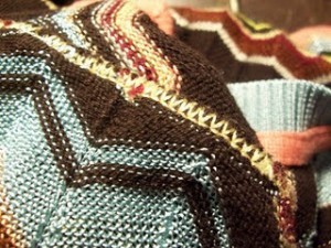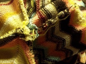 Above, you can see also that there are threads all over. Also, do you see that yellow thread going all the way down the sideseam? Well, it's there because when the stripe is knit, that yarn needs to be picked up again to make another stripe. Cutting and knotting and trimming those babies costs a fortune because someone has to do it. And even though you think little girls in China are being paid four cents a month to do it, the amount of labor that would go into doing that would be egregious.