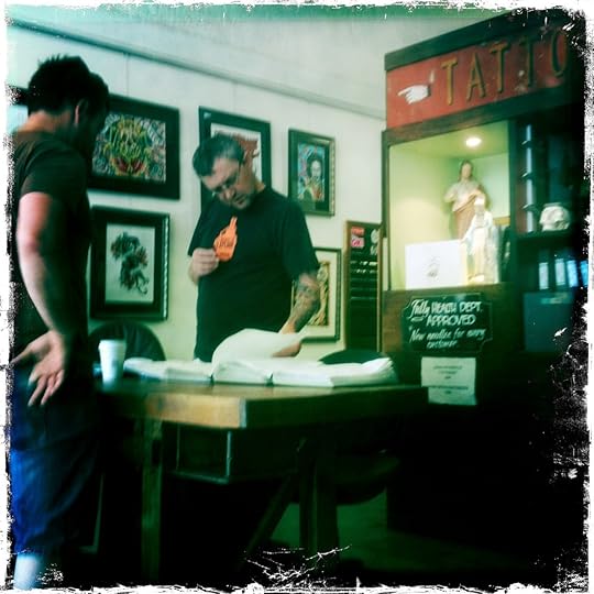 You will note the small idols of various in-vogue deities next to the counter. I took their vacuum-molded presence as a bad sign. As if the owners were telling me 'Dude, this tattoo is going to hurt so badly, you'll rediscover your catholicism just so you can pray for mercy. And lo, sinner, thou shalt find NONE'.