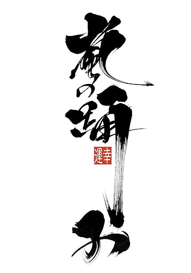 The characters, top to bottom, are 'Arashi' (storm) 'No' (a pre-posessive) 'Odori' and 'Ko' (which together, make Dancer). So, Stormdancer. The red seal is for good luck.