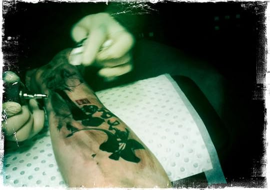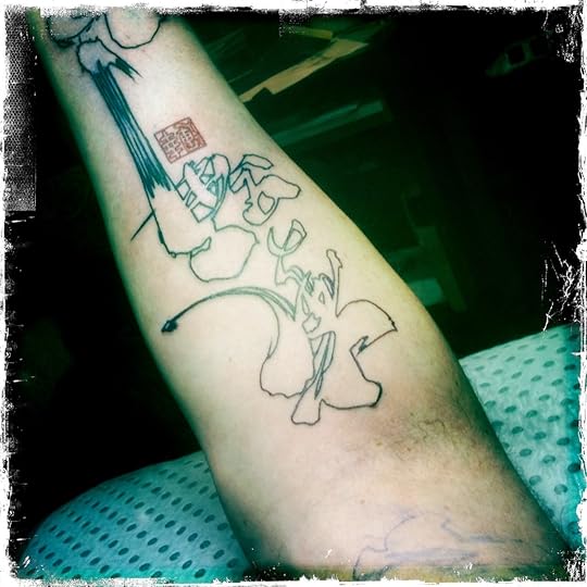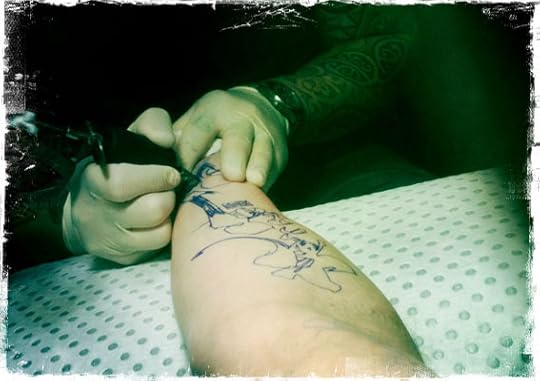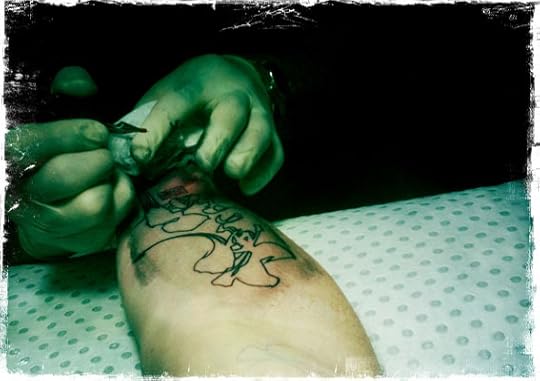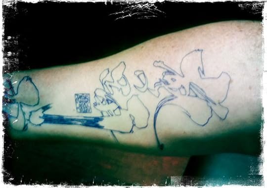 This is the stencil on my arm. The tattoo people have this magic stuff they spray on your skin, then lay the stencil over the top, peel it away, and bam, all they have to do is trace the design. I was reminded of the scene in Chasing Amy where Jason Lee flips out when someone calls him a tracer. This made me giggle a bit. At the sound of my giggling, Shane looked up at me like, if it was within his power to do so, he would travel back in time and tear my grandfather's scrotum from his body, just to stop him siring the man who would sire me.
