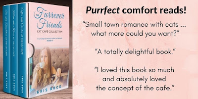 My Furrever Friends Sweet Romance series features the employees and customers at a cat café. Watch as they fall in love with each other and shelter cats. The series starts with Coffee and Crushes at the Cat Café – which is only 99 cents, or free in KU! Learn more at my website or visit my Amazon US pageor Amazon UK page. (For other countries click here.) Sign up for the Kris Bock newsletter.