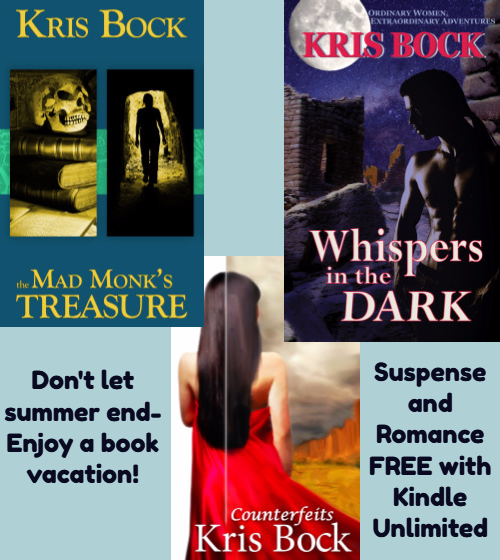 Kris also writes romantic suspense set in the Southwestern U.S. If you love Mary Stewart or Barbara Michaels, try Kris Bock’s stories of treasure hunting, archaeology, and intrigue in the Southwest. Learn more at www.krisbock.com or visit Kris Bock’s Amazon US page or Amazon UK page. (For other countries click here.)