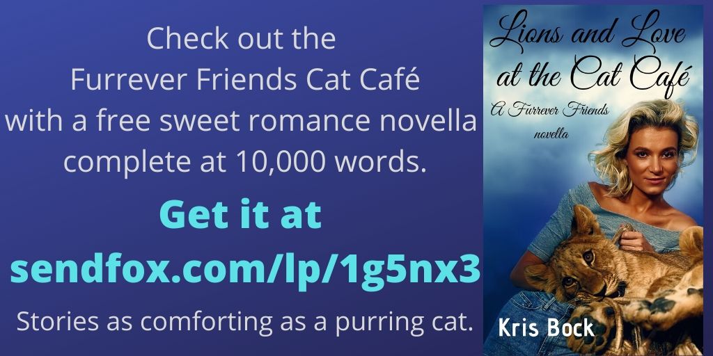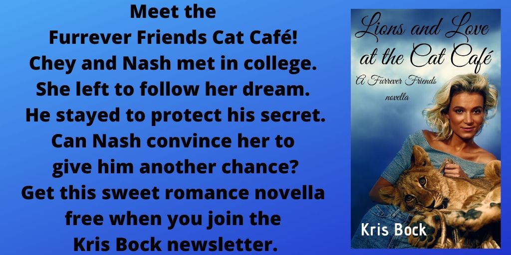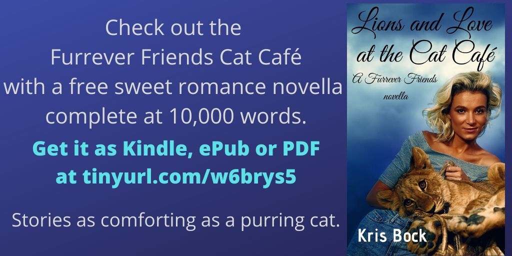 Lions and Love at the Cat Café is available in PDF, MOBI, and ePub. Get it free when you sign up for the Kris Bock email newsletter.