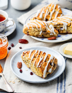 Preheat oven to 375°. Soak cherries in juice for at least 10 minutes while you mix other ingredients.Mix the flour and ¼ cup of the sugar. Blend in the baking soda, baking powder, salt, and nutmeg. Cut in the butter with a pastry blender or two knives until the mixture has fine crumbs. Stir in the egg, yogurt, and zest. Drain the cherries or other dried fruit well. Mix them in.Spray a baking sheet lightly with oil. Turn the dough onto the baking sheet. Pat it down into a 9-inch circle. Cut the dough into 8 wedges. Separate them slightly. You may sprinkle with additional sugar if you want them to sparkle a bit.Bake until golden and firm, about 20 minutes. Serve warm with butter … or clotted cream, orange marmalade, or jam.