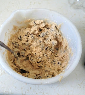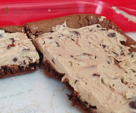 2. Make the cookie dough layer: Cream the butter and both sugars in a mixing bowl. Blend in the milk and vanilla. Blend in the flour. Stir in the chocolate chips.