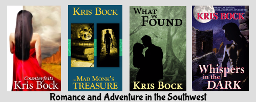 Kris also writes romantic suspense set in the Southwestern U.S. If you love Mary Stewart or Barbara Michaels, try Kris Bock’s stories of treasure hunting, archaeology, and intrigue in the Southwest. Sign up for Kris Bock’s newsletter for announcements of new books, sales, and more.