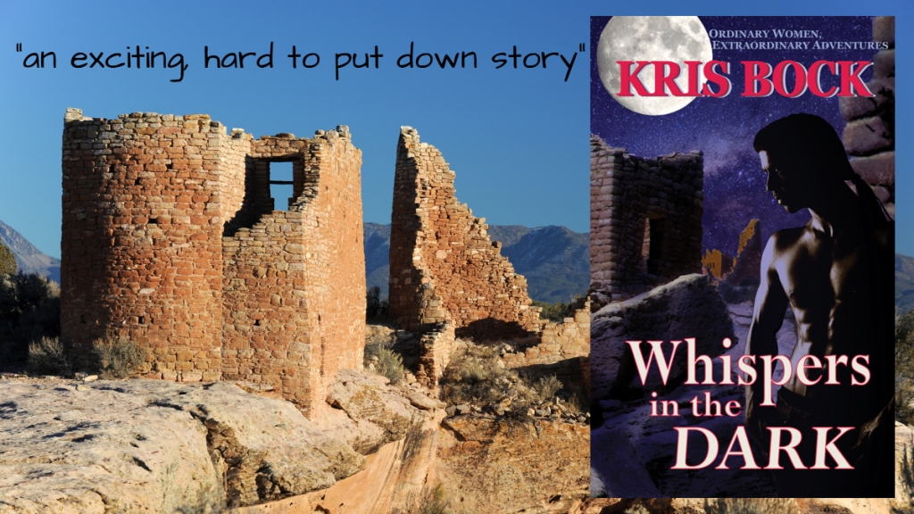 Kris Bock lives in New Mexico, where she enjoys hiking, watching the sunset from her patio, and hanging out with her husband and their ferrets. Her BFA in photography is used mainly to show Facebook friends how lovely the Southwest is. Kris writes novels of suspense and romance with outdoor adventures and Southwestern landscapes. Whispers in the Dark features archaeology and intrigue among ancient Southwest ruins.