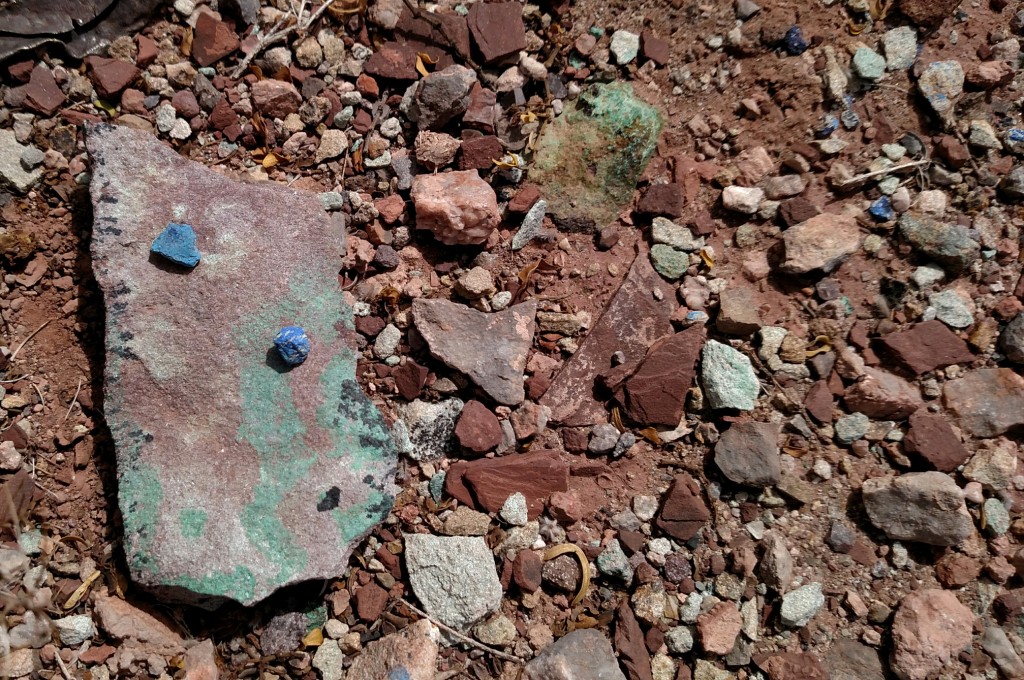 In the detritus from the old mine, you can find small, brilliantly colored samples of azurite (blue) and malachite (green), as well as larger chunks that show the color but aren't pure.