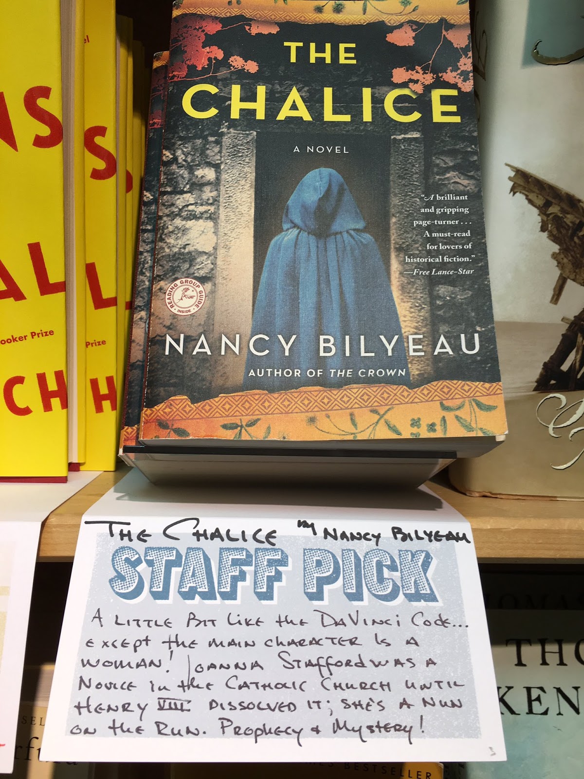 The "Staff Pick" note says, "A little bit like The DaVinci Code...except the main character is a woman! Joanna Stafford was a novice in the Catholic Church until Henry VIII dissolved it; she's a nun on the run. Prophecy & Mystery!"