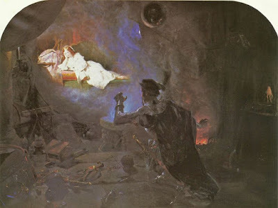 So Surrey and Genevieve weren't really in love and Surrey never traveled through Italy. It's settled. Yet, nonetheless, Agrippa conjuring up Geraldine in a magic glass for Surrey is a story that kept showing up in art and letters. Watercolour painter Edward Corbould, favorite of Prince Albert, was the toast of London with his "The Earl of Surrey Beholding the Fayre Geraldine in the Magic Mirror."