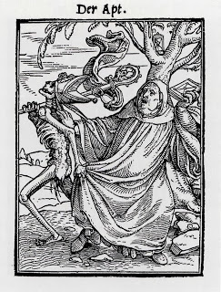 It is in his woodcuts that Hans Holbein the Younger gives some indication of his religious beliefs. He designed the title page of Martin Luther's bible. And he created woodcuts for The Dance of Death, an eerie series of drawings showing a skeleton reaching for people across every level of society: merchant, king, abbess, old woman---and pope. Death came to everyone, high or low, was the message.