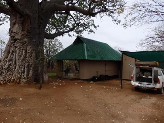 Five kms after entering Zimbabwe, we reached the Gonarezhou National Park gate and were allowed to enter after our reservations had been confirmed. We drove what we later found to be the long way round to Mabaluata, where we signed in and paid for our accommodation because we hadn’t been able to pay online for whatever reason. We then drove 5.6 kms to Swimuwini Chalets (the place of baobabs) on the Mwenezi River, with a huge baobab just outisde.