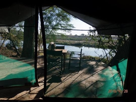 He objected to us walking too close, and charged us. We had to duck behind one of the bomas separating the chalets, and then he stood outside for a long time before moving off and crossing the river.