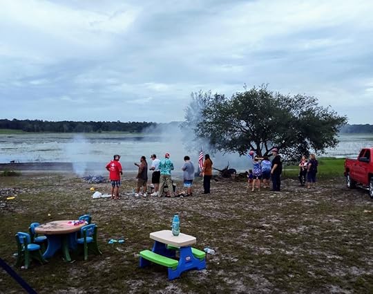 People were playing cornhole—a game that involves throwing beanbags (filled with corn so maybe cornbags?) through a hole in a wooden stand. People danced to Lazy J’s music and drifted over in ones and twos to introduce themselves and chat a bit. Most of them were vets (Ex-military) and we couldn’t wish to meet anyone nicer. Kids played on a jumping castle, ran around yelling, and waved sparklers and a couple of teenagers swam in the lake.