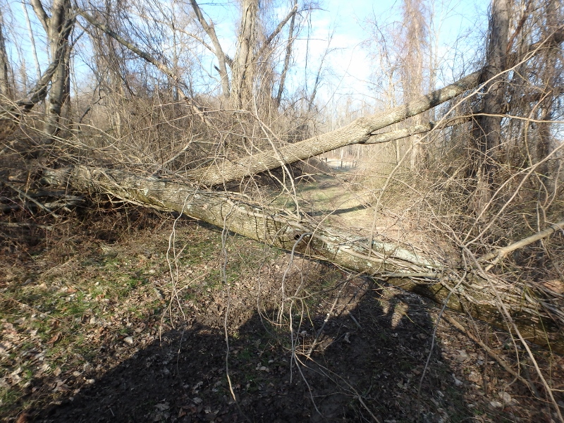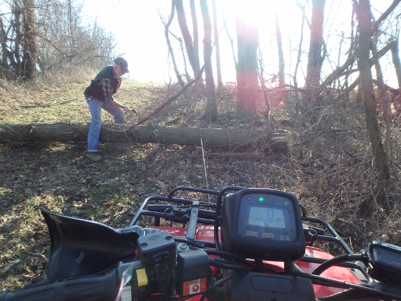 At the far end, another trail leads to the next farm. We started down it, but came to this. Hubby's little ax and the winch weren't going to put a dent in this downfall.