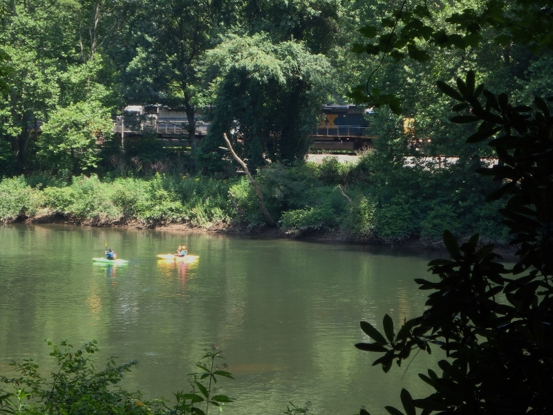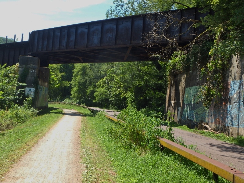 The Great Allegheny Passage is an old railroad bed. Across the river, a still-active line carries a lot of train traffic. One train passed while I was taking photos.