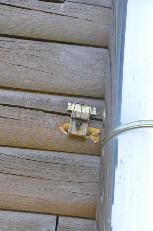 No, we never planned on catching one. But we figures the drumming would set off the trap. The snap would scare off the woodpeckers. No such luck. They just moved to another bore bee hole. By the way, the reddish stuff you might see on the holes? Hot sauce. We tried everything to discourage the winged beasts.