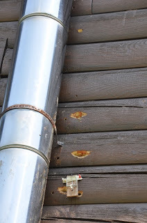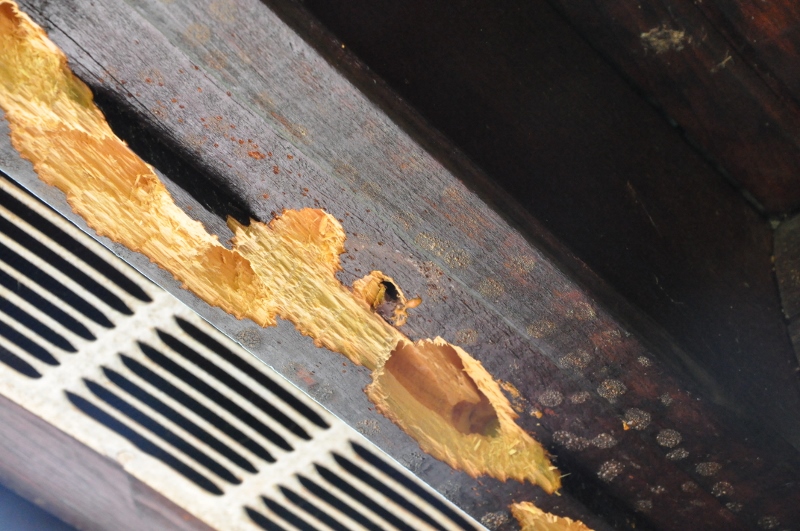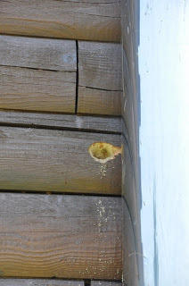 We’ve battled bore bees AKA carpenter bees for years. The large, but stinger-less insects drill perfect little holes in our logs and lay their eggs. During our absence, a pair of woodpeckers discovered the bee larvae smorgasbord and turned those little holes into BIG GAPING holes.
