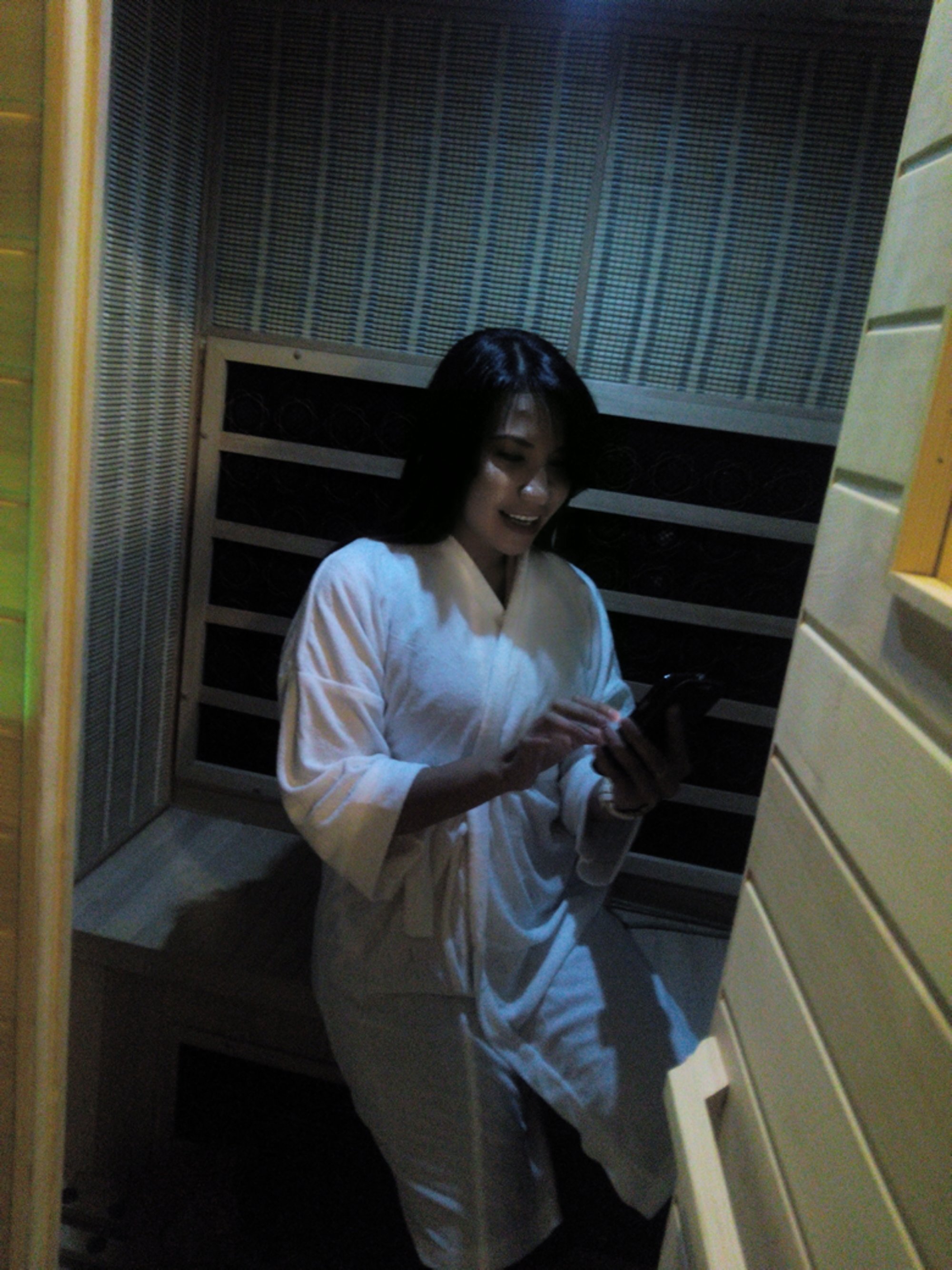 DJ Elly preparing to enjoy the sauna.
