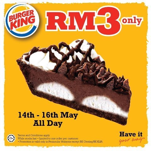 To enjoy this exclusive offer, you got to go to Burger King’s Facebook Page http://www.facebook.com/bkmalaysia and LIKE the page. Print out the voucher and show the voucher at the counter when purchasing the Hershey’s Pie to enjoy the RM3 offer.