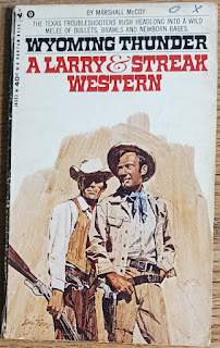 So, Marshall McCoy is Marshall Grover is Leonard Meares. LeonardMeares (1921-1993) was an Australian writer who is listed as the author of 700+ novels, although—to be clear—most of these are generally of novella length.As you can see, Wyoming Thunder clocked in at 86 pages. In addition to McCoyand Grover, Meares also used the names Ward Brennan and Glenn Murrell, and occasionallyBrett Waring and Shad Denver, as well as writing works under his own name. He apparentlywrote over 400 in the Larry & Stretch series. It looks like many werewritten for a western magazine, thus explaining the shorter length. He alsowrote about 60 in another series called Big Jim, although there could be more.He also did standalones. To add to the confusion, his books have been reprintedin other countries and languages, and sometimes with different author names andeven character names.