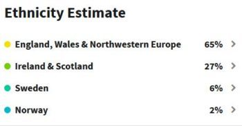 A few days ago Ancestry sent me an email saying my DNA results have been “updated.” They mentioned this early in the process, that the science is always evolving and being refined or somesuch. And I might receive updated info. In any case, here’s how it looks now. Previously it was 64% England, Wales & Northwestern Europe, and 36% Ireland & Scotland. So, the England part was increased, and the Ireland/Scotland hunk was split off with some Viking. Huh. Maybe my Mom is right… it’s all a bunch of crap?