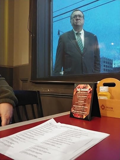 It’s from Saturday night at Backyard Ale House in Scranton, a truly great bar/restaurant. We’re seated by the front window, and he’s outside having a smoke. We can see out, but he can’t see in. Result: magic! One of my all-time favorites.