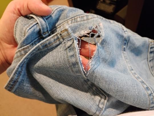 LOOK AT THAT! In case you can’t tell, it’s the upper right side of the left pocket. That’s where they always give way. Without exception. And why is that? Why there, specifically? I mean, I’ve been blaming the ass itself for this unstoppable destruction. And rightly so. I mean, there’s a substantial amount of volume back there, and standard commercial fabric can only be expected to withstand so much pressure. Indeed, the shredding never ends! As I mentioned in a recent episode of the podcast, I’m blowing up a pair of pants every other month at this point. Always at the upper right side of the left pocket. WTS??