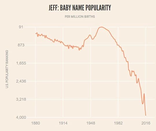 So, except for the syllable complaint and the accidental John F. Kennedy connection, I’m cool with it. Jeff is a good solid name. Right? Unfortunately, I don’t think there are many current kids named Jeff. According to that chart, we had our day in the sun during 1962 and 1963, then it all went off a cliff. Oh well. We’ll rebound. Jeff will live to fight another day. There will be more baby Jeffs! Mark my words.