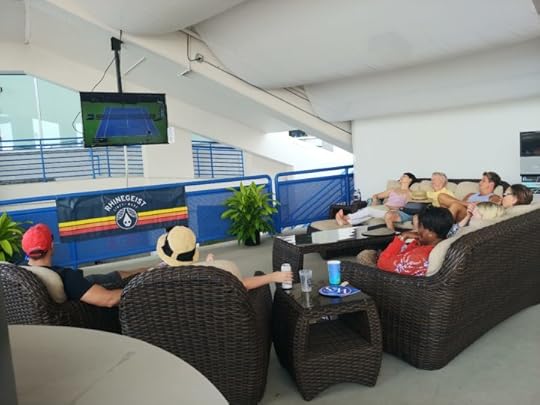 A corner of the massive Rhinegeist “party patio.” People are sleeping in there! Or watching tennis on TV! The actual match is happening on the other side of that wall. That sun will flat out destroy you. We had one pint each, and they cost $11 per cup. Later that day we bought a 12-pack of the same beer for $17.99.