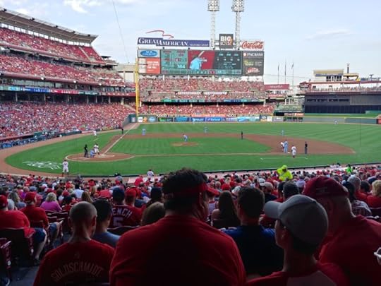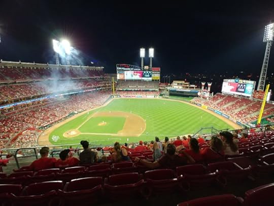 After it was clear Toney was done for the day, due to high heat, etc., I walked across the street and took in a Reds game alone. I told the girl at the box office to give me a seat that’s cheap and in the shade. This one cost me $19, and I was indeed out of the sun. The photo was taken after dark, of course, but it was bright sunlight when I arrived. It was fun, even though the Reds got the everlovin’ shit kicked out of them. Oh well.
