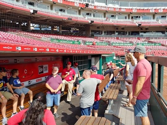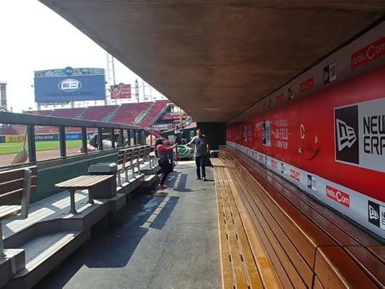 Our tour group inside the Reds dugout. And how cool is that?! The bench, by the way, has cool air blowing up through the slats, to keep your balls at a reasonable temperature. This part of the tour might go down as one of the most memorable things I’ve ever done. I was about to soil myself. Sometimes I think I’m dead inside, but baseball makes me realize it ain’t quite so. Not yet.