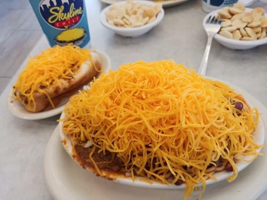 My lunch at Skyline Chili. I wish I’d gone with the extra cheese option. This is a so-called Five Way, and a Cheese Coney.
