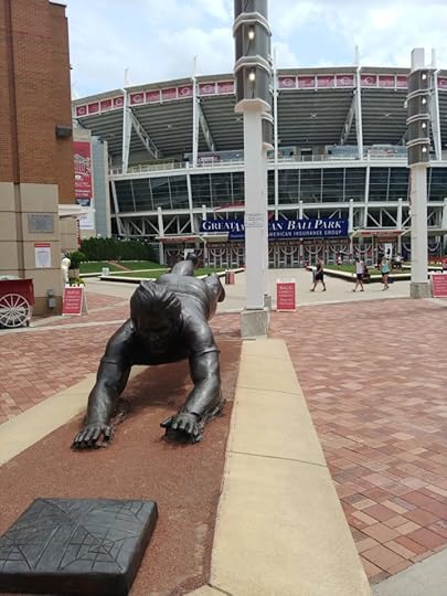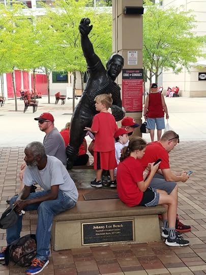 People huddled around the Johnny Bench statue. I had to fight the urge to run over there and start hollering, “Have some respect, assholes!”