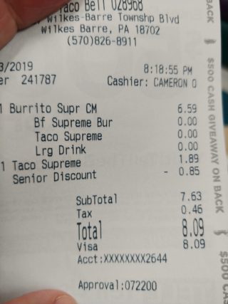 — In more upsetting news, I recently visited a Taco Bell near my job. I always get the same thing, and know exactly how much it costs. This time it was cheaper, and I assumed the dipshit cashier rang it up wrong. So, I snatched the receipt out of his ball-juggling fingers and took a look. Check this shit out! The little prick gave me a Senior Discount. I just looked up from the receipt and said, “Are you serious?” and he about shit himself. We’d had previous encounters, and I clearly unnerve him. He just turned and scampered into the kitchen. Senior discount! Does a senior eat all that stuff? No, he does not! He eats one taco and a small coffee. I’m getting fired up just thinking about it.