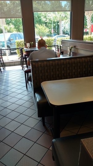 We made a beeline for Chick-fil-A and had lunch. The place was pandemonium, and there was a guy there with a man-bun who pretty much acted as our dedicated chicken sandwich concierge. Oh, he was nothing if not eager to please. Here he is in silhouette, in a photo I snapped on a subsequent visit. He was apparently on a break this day, and his majestic bun is clearly visible.