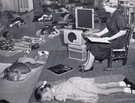 We had nap time, like the kids in the picture above. All of us had these scratchy plastic-covered mats that folded into thirds, and we’d put them on the floor and “nap” as the teacher read a story or played a record. I don’t think there was much sleeping going on, but everybody did settle down for a while. It seemed weird to me, as I recall. I felt vulnerable, like somebody was going to shank my ass.