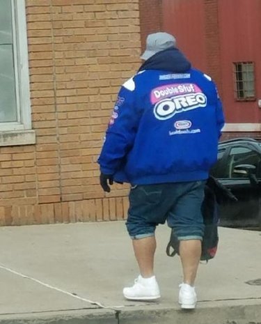The younger boy sent me this photo today, which he snapped on the mean streets of Scranton. What do you think is going on here?? Is it some kind of NASCAR thing? Or does this fashionable gentleman simply have a passion for the Double Stuf Oreos and feels compelled to do his evangelical duty? Perhaps he works for Nabisco? …Or Kraft? I don’t know what the shit is happening. Also, are those regular jeans pulled up to his knees, or are they some kind of portly-man capris? The Gilligan hat is a nice touch, I think.