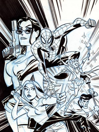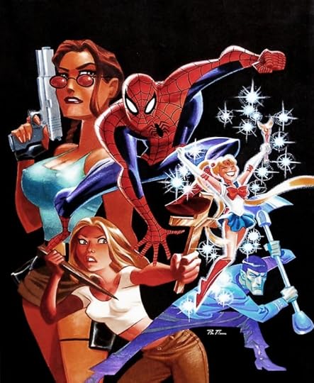 WonderCon 1999 program cover illustration made by Bruce Timm, featuring various characters from fictional works (Spider-Man, Tomb Raider, Buffy the Vampire Slayer, Star Trek, Sailor Moon)