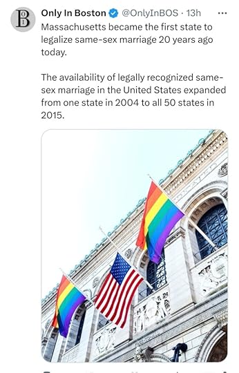 It is May 17, 2024. Happy 20th Anniversary to legal status for same sex marriages here in Massachusetts.