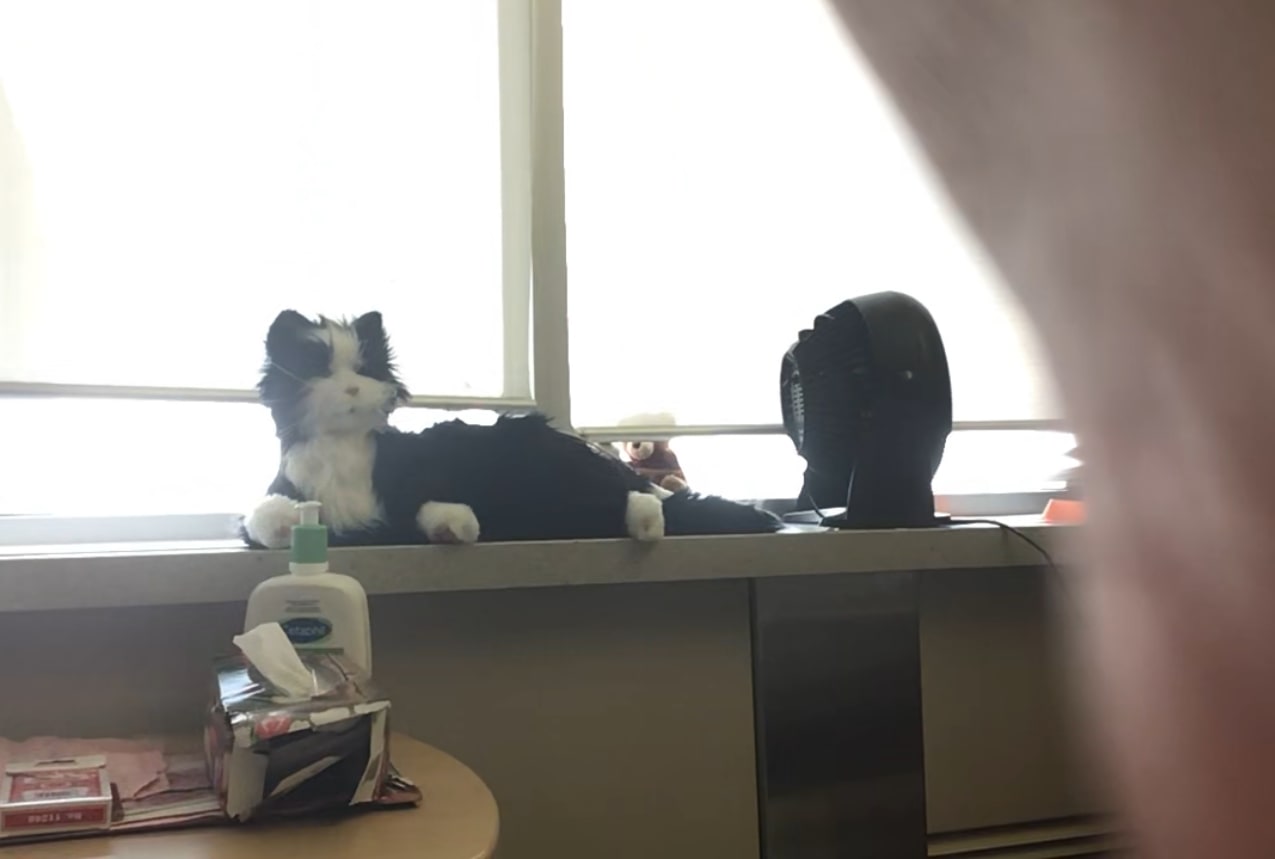I ask her if she knows the cat is not real, and she says that she does. I explain to her that it’s a therapy cat, and it’s supposed to make her feel better.