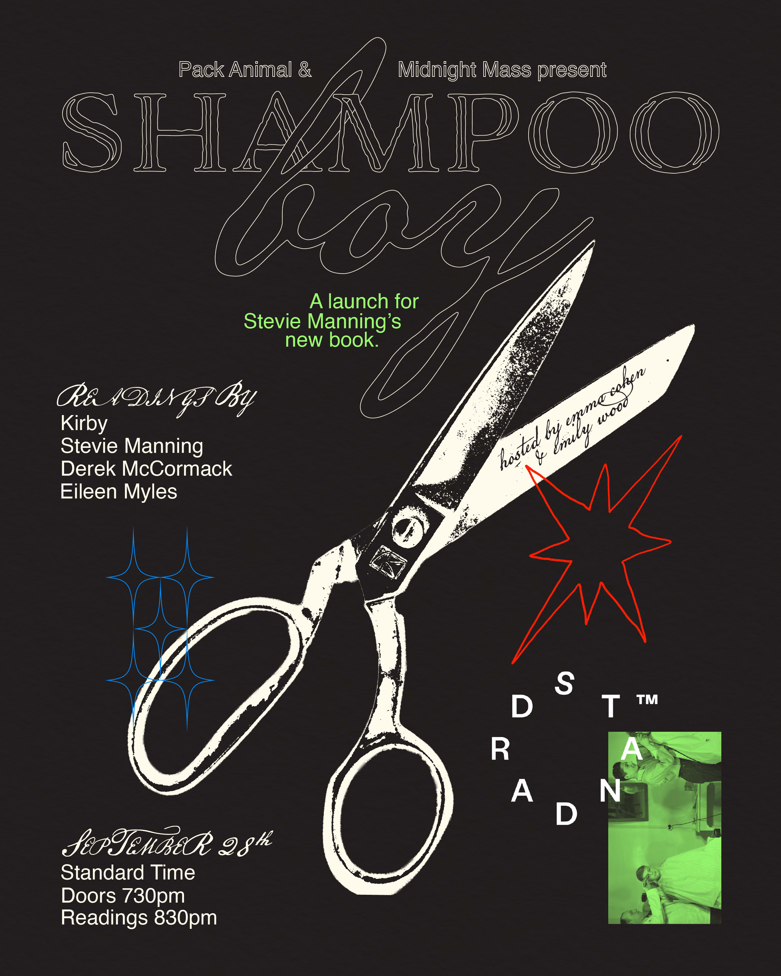 Next appearance: STEVIE MANNING Shampoo Boy Launch w/Derek McCormack & Eileen Myles 28 September at Standard Time (165 Geary Ave) Toronto TICKETS