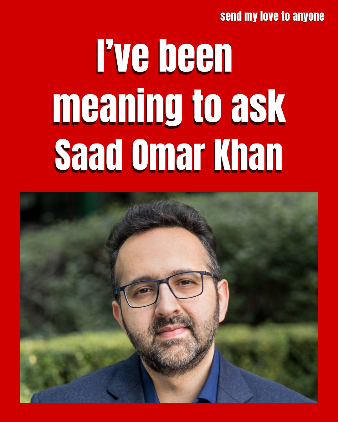 Saad Omar Khan was born in the United Arab Emirates to Pakistani parents and lived in the Philippines, Hong Kong, and South Korea before emigrating to Canada. In 2019, he was longlisted for the Guernica Prize for Literary Fiction. His short fiction has appeared in Best Canadian Stories 2025 and other publications. Saad’s debut novel Drinking the Ocean was published by Buckrider Books/Wolsak & Wynn in 2025. He lives outside of Toronto and is currently working on his second novel.Support Send My Love to AnyoneSupport Send My Love to Anyone by signing up for a monthly or yearly subscription, liking this post, or sharing it