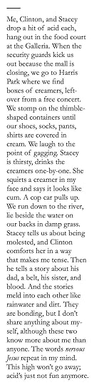 We run down to the river, lie beside the water on our backs in damp grass. Stacey tells us about being molested, and Clinton comforts her in a way that makes me tense.