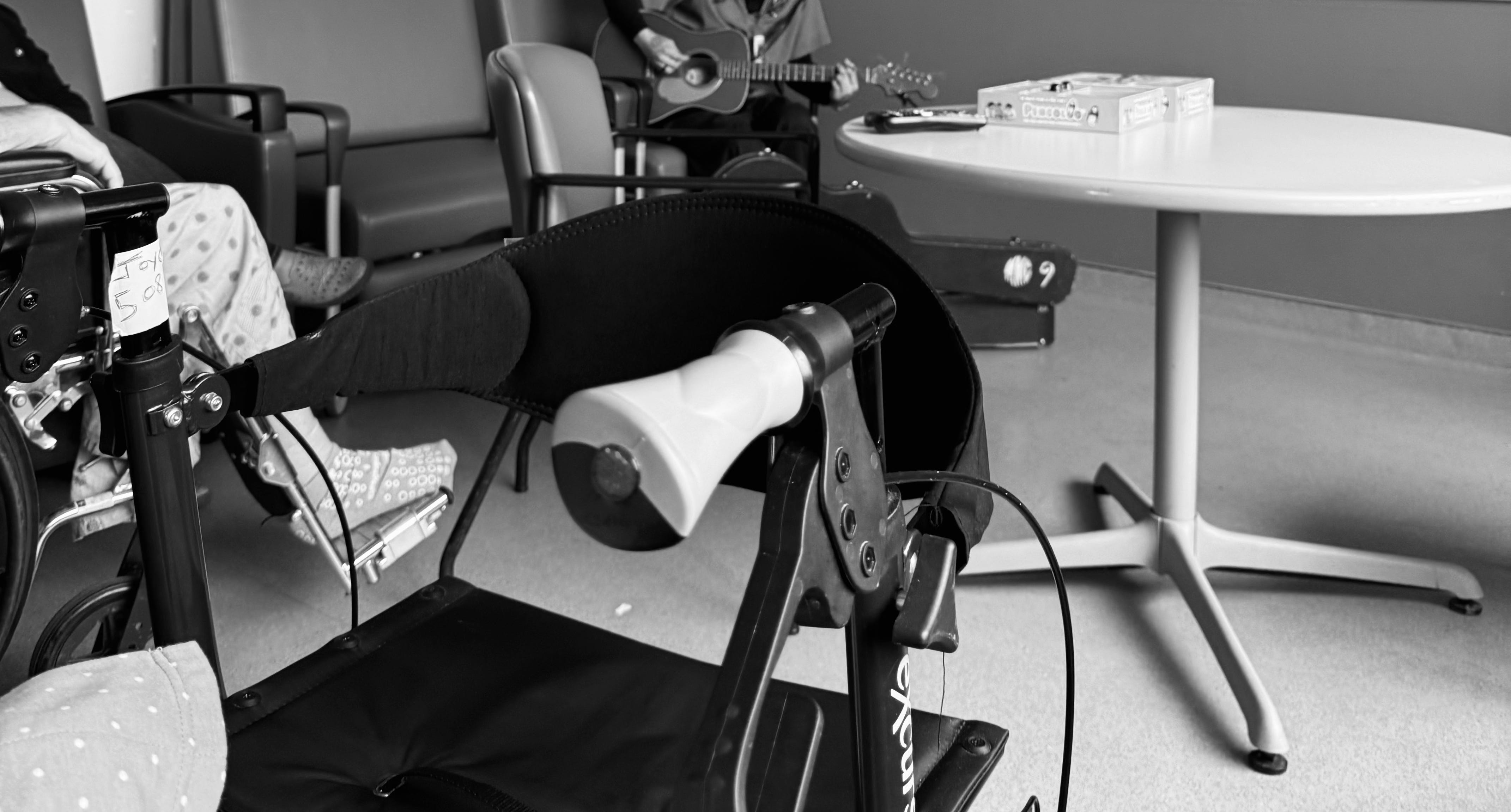 A worker at the hospital is playing some songs in the waiting room for patients. There are two women there—one is a visitor, the other a patient in a wheelchair. They look about my age and are very welcoming as we sit down and listen to the music with them.