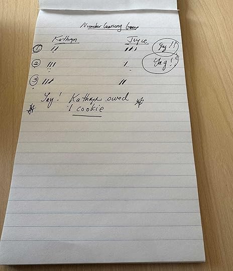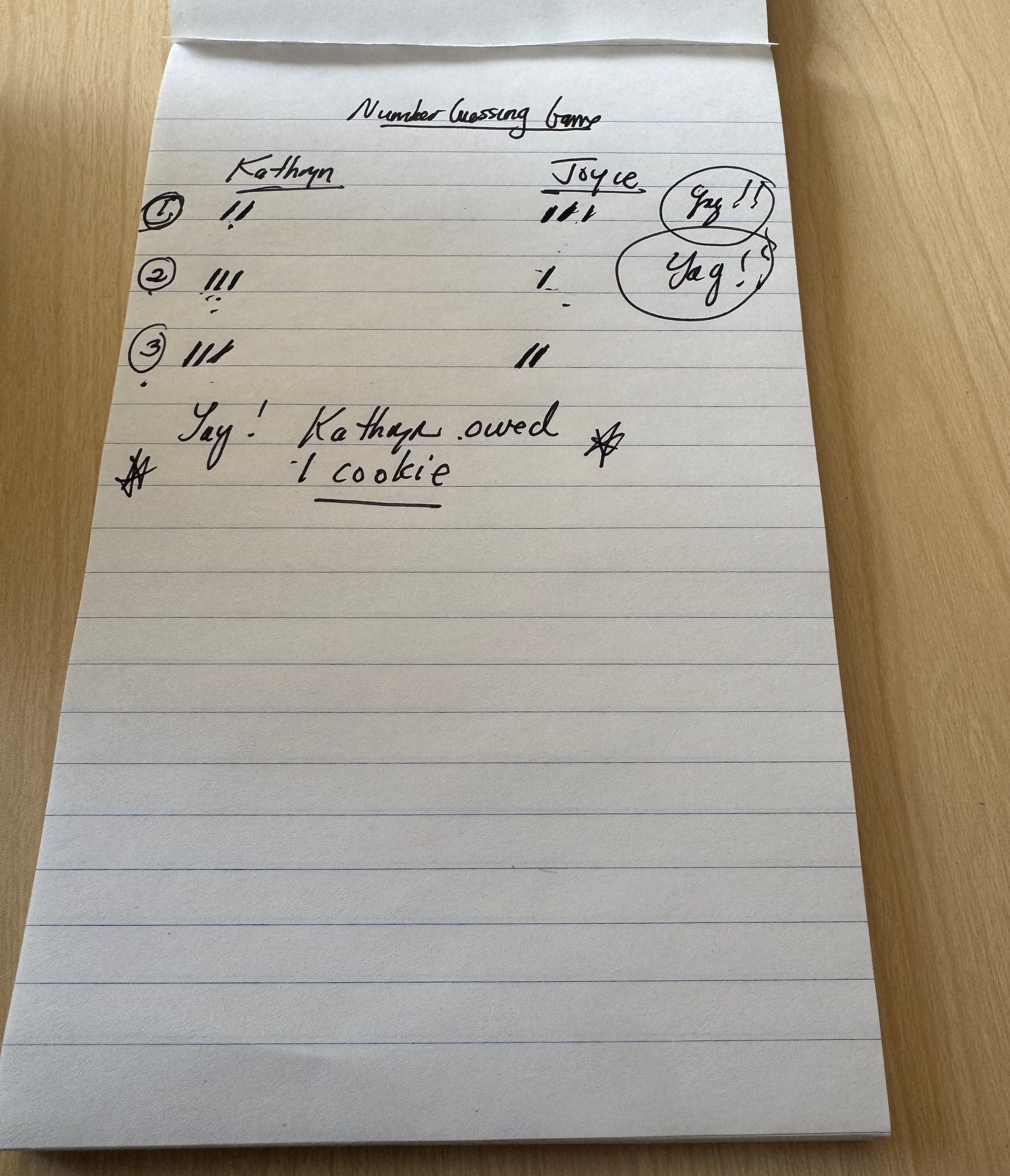 Something like “The stakes are high, Joyce has won two games in round one and Kathryn has only won one. Now it’s Kathryn’s turn to guess the number between one and ten. Who will win the cookie? Is Kathryn Psychic?”