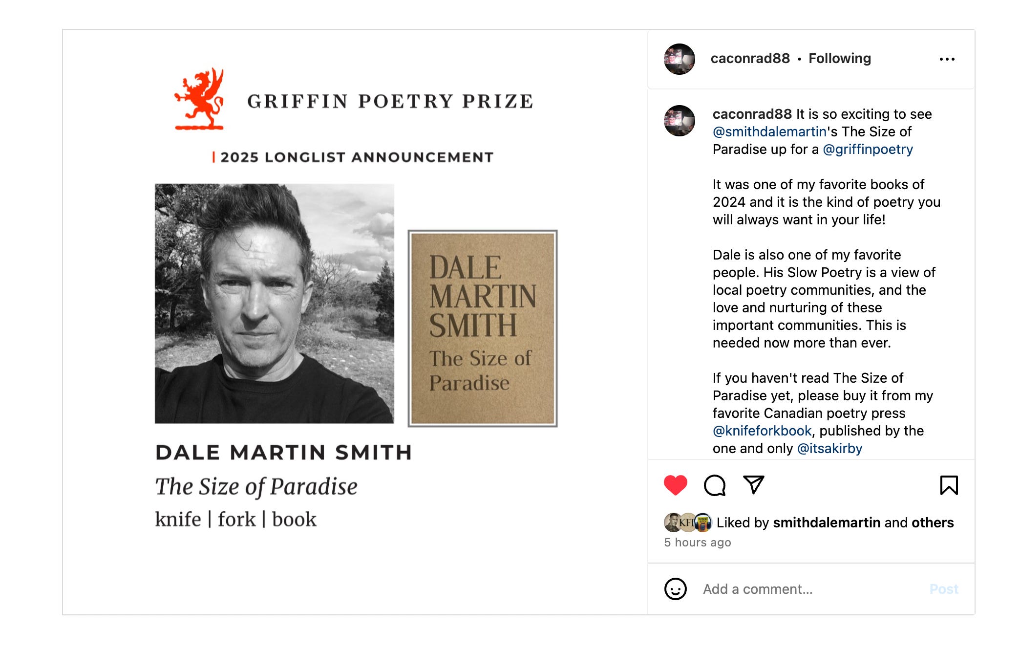 On a certain morning, mid-March, I was wakened by a fellow poet in Montreal, “Kirby, you’re going to the Griffins!” followed by a few similar texts, then going online to see what the fuss was actually about, and indeed my dear poet friend Dale Martin Smith’s brilliant long poem, The Size of Paradise was selected as a Finalist for the 2025 Griffin Poetry Prize which I published at knife | fork | book.
